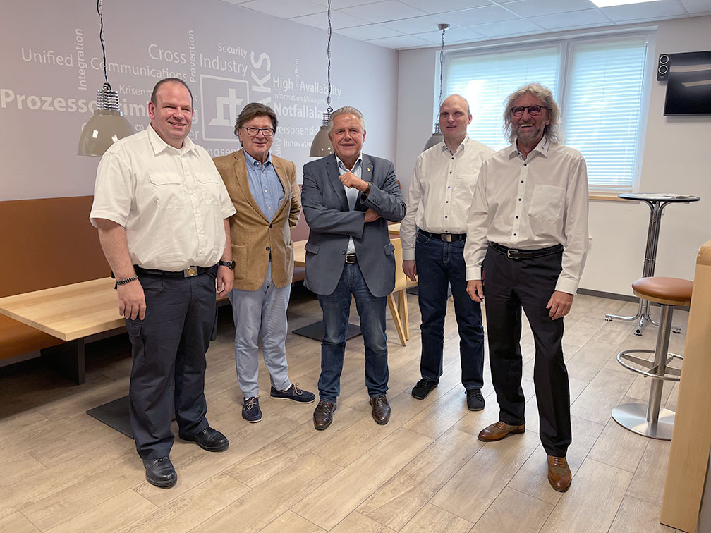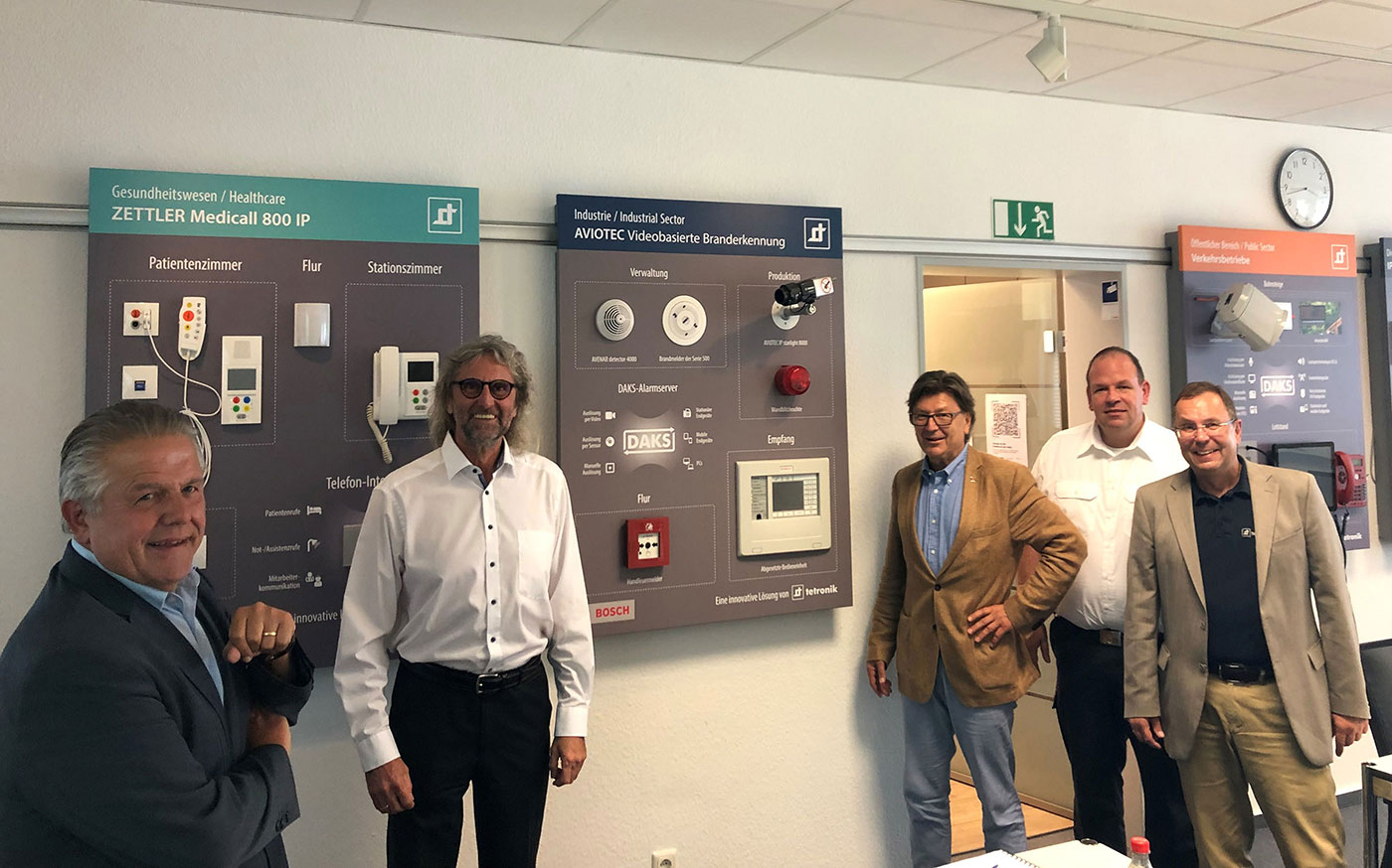 (v.l.n.r.) Taunussteiner Stadtbrandinspektor Martin Zywitza, Erster Stadtrat Peter Lachmuth, Erster Kreisbeigeordneter Klaus-Peter Willsch MdB, tetronik-Sicherheitsbeauftragter Heiko Schmid, tetronik-Geschäftsführer Winfried Geutsch am Taunussteiner tetronik-Firmensitz