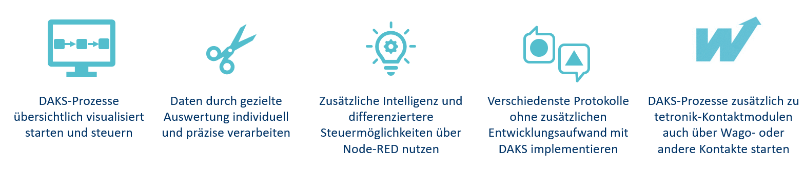 Bisher standen mit dem DAKS-IoT-Paket tetronik-Nodes für Prozesssteuerung, Events, Logging und Variablenermittlung zur Verfügung, die hier genauer beschrieben werden. Mit der neuen Hardware kommen mit der Input- sowie Output-Node zwei neue Nodes dazu. Sie dienen der Erkennung, Steuerung und Auswertung des Status der Hardware-Ein- und Ausgänge.
