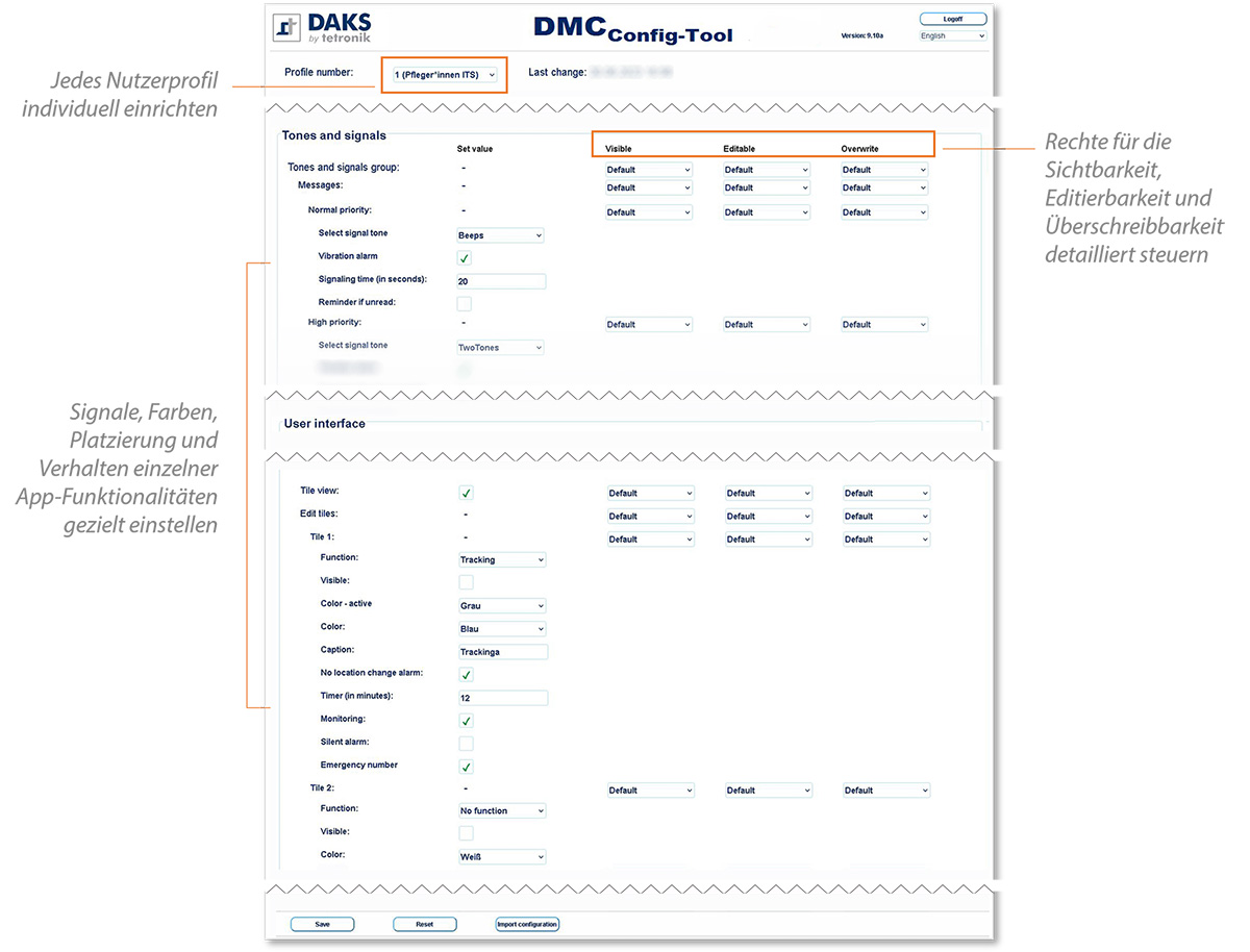 So erhält beispielsweise die Pflegekraft einer psychiatrischen Abteilung ein fertiges Profil mit zentral positioniertem und farblich hervorgehobenem Alarmauslöse-Button und voreingestelltem Ortungston. Andere Funktionen, die die App grundsätzlich beinhaltet, sind für sie nicht sichtbar, sodass eine Fehlbedienung unter Stress ausgeschlossen werden kann. Auch ein Menü entfällt für diese Nutzergruppe – individuelle Einstellungen, wie z.B. das Ändern der Buttonfarbe oder der Ortungstonlautstärke, werden somit unterbunden.