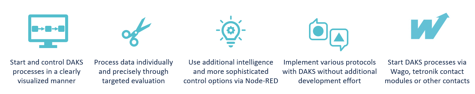 Node-RED is used by almost all common IoT manufacturers. DAKS-IoT based on Node-RED enables the integration of a wide variety of sensors, regardless of manufacturer or data format. This in turn allows the smooth combination of different technologies and devices and simplifies the implementation of product updates or the replacement of individual components. Overall, Node-RED not only simplifies the effort involved in setting up and maintaining IoT environments, but also simplifies DAKS communication processes.