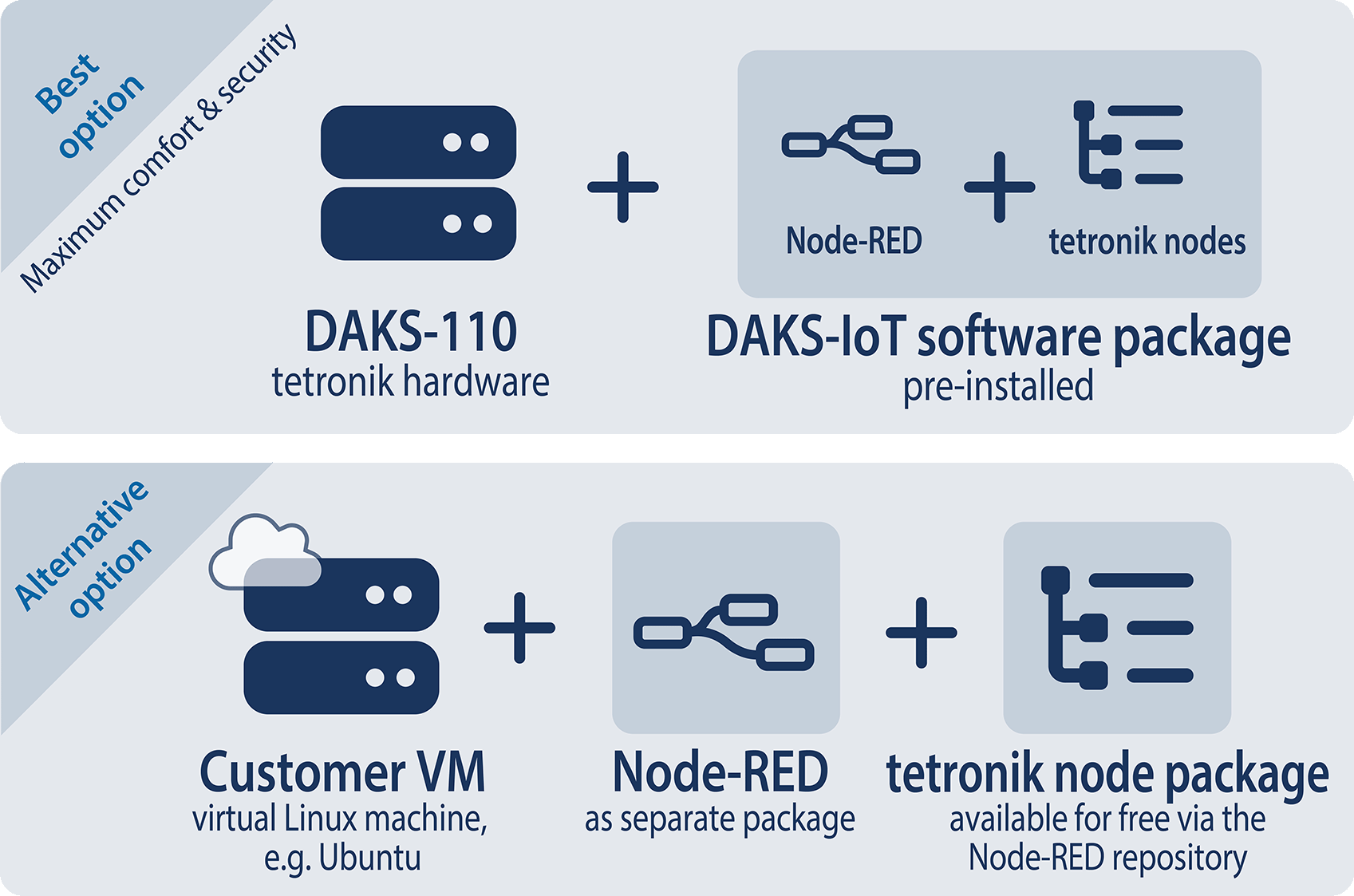 The tetronik node package is open source and available for free in the Node-RED repository (node-red-contrib-tetronik-daks-iot). If you already have a Node-RED customer instance, the package can be used directly with DAKS (this requires a free ESPA-X license on the DAKS server). Hardware-specific nodes are only available with the prebuild DAKS-IoT image.